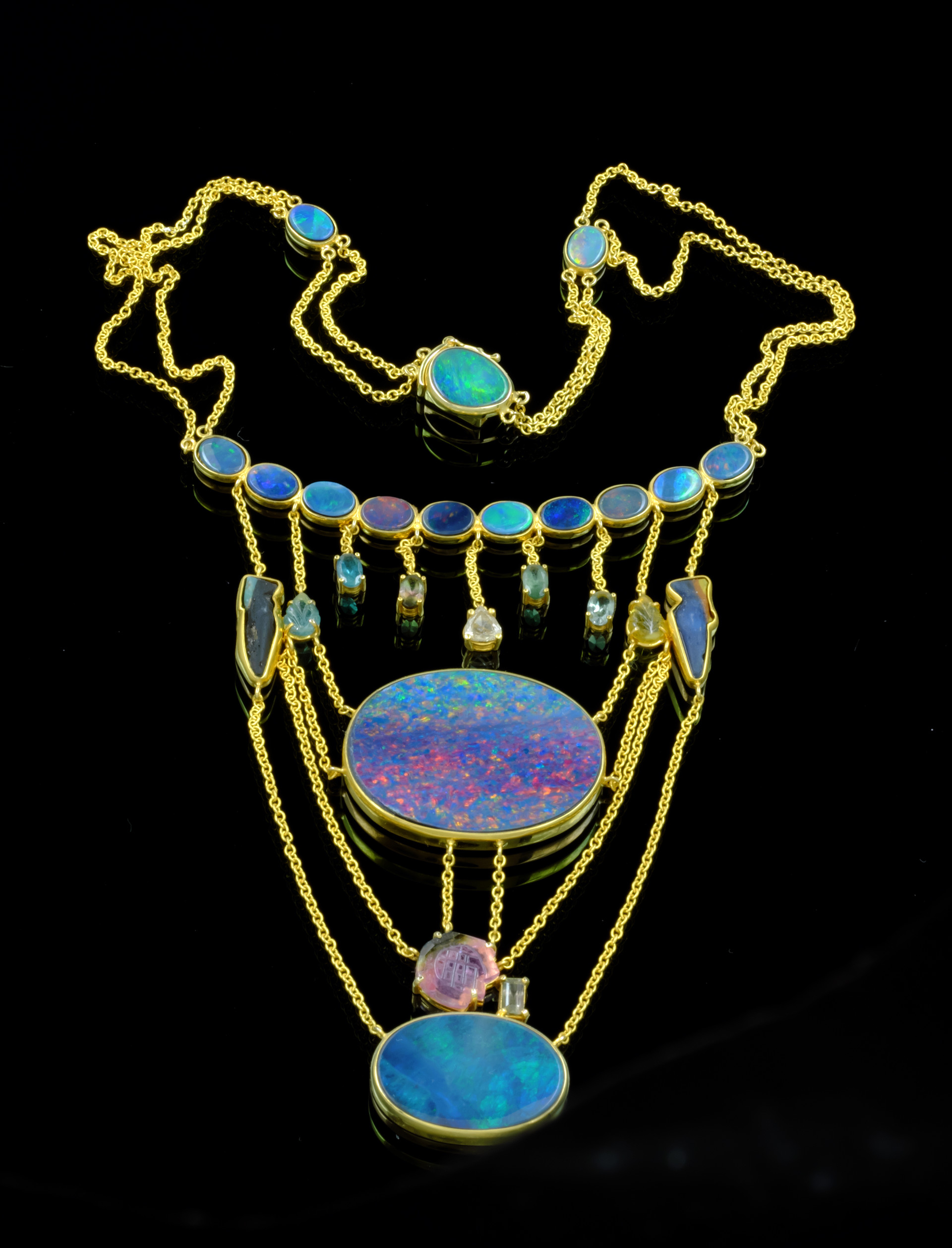 Tourmaline, Roman glass, Opal, Diamond, Ammolite & Gold